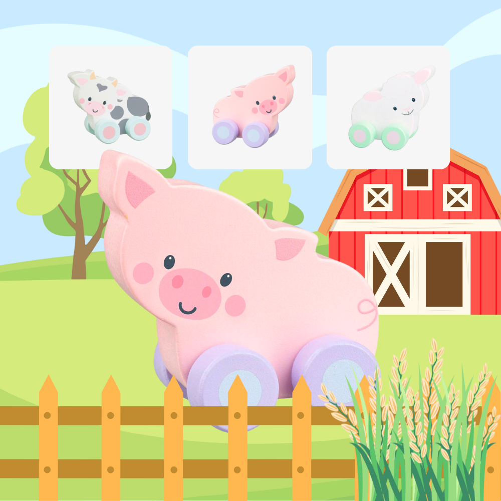 This beautiful set of wooden toy cow, sheep & pig with wheels is a great first wooden push toy set for little hands. From the Farmyard collection, the set features 3 little beautifully painted farm yard animals!
