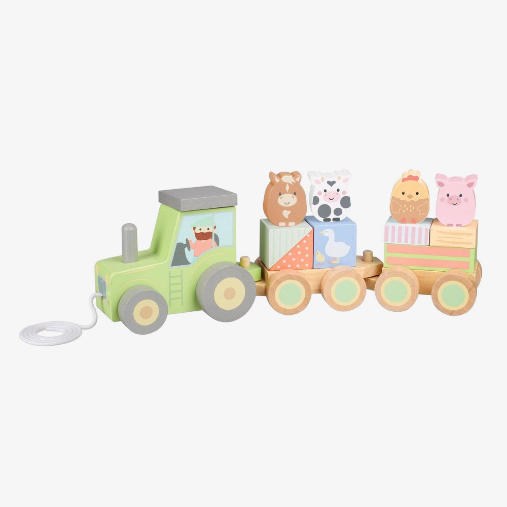 The new Tractor Puzzle Train includes a pony, cow, chicken and pig and other building blocks. This toy combines fun and learning, allowing children to explore farming life and spatial awareness while assembling and reassembling the blocks.