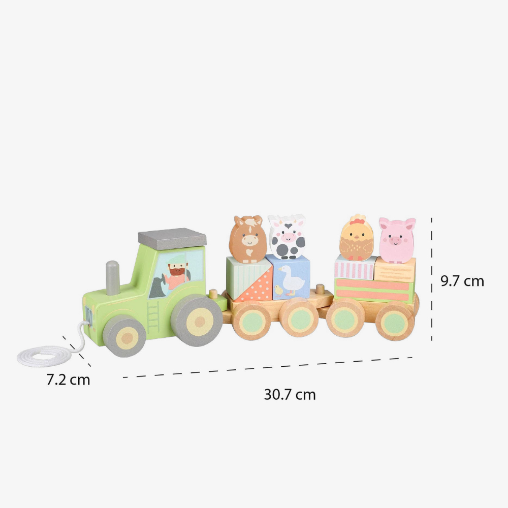 Encourage little ones to use their creative young minds with this wooden toy tractor, pull along wooden train. Not only does it develop imagination and creativity skills, it also fosters the development of hand-eye coordination and fine motor skills when children are deciding where to put the patterned blocks and farm animals.